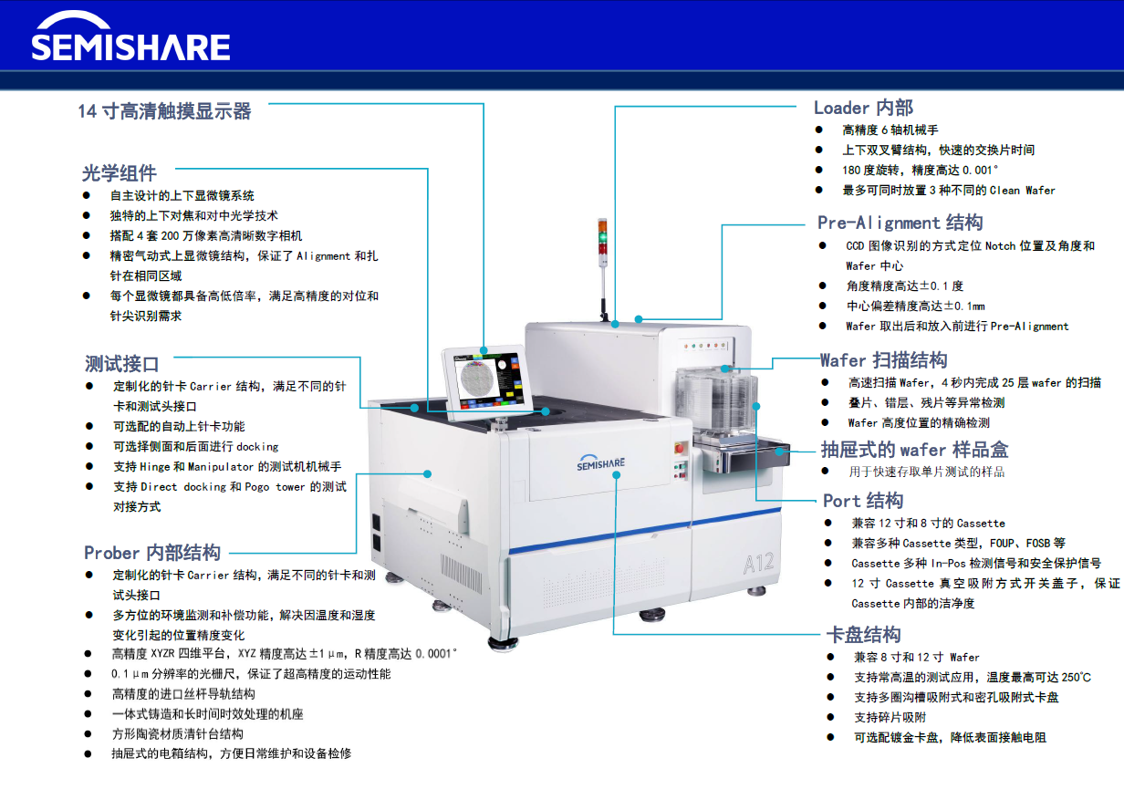 ● 高效率:自研预对准模块集成,晶圆可无损自动上下片,7*24小时全天候在片探测 ,实现安全高速的晶圆传输